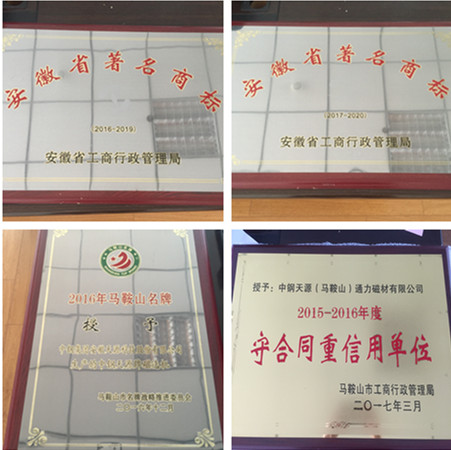 近日,中鋼天源被授予“安徽省著名商標(2016-2019)、”、“安徽省著名商標(2017-2020)”、“2016年馬鞍山市名牌產品”等榮譽稱號,同時通力公司被評為“重合同守信用單位(2015-2016年度)”。